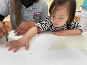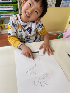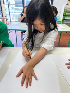 今日のArt Timeでは2週にわたるプロジェクトで手形を使ったMuralを作成します。