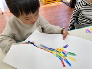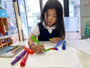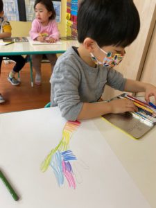 マーカーを選ぶ子、色鉛筆を選ぶ子、自由な作品になりました。