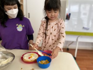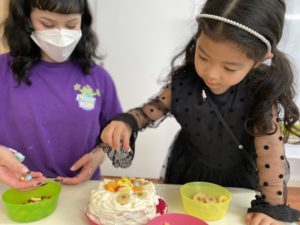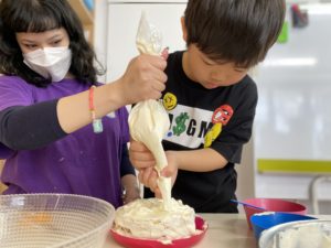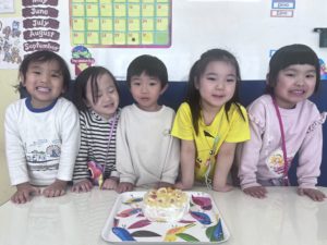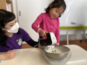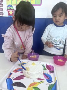 公園でたくさん遊んだ後は、ケーキ作りをしました。