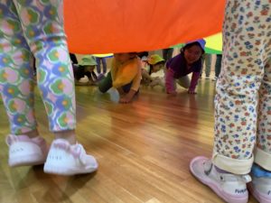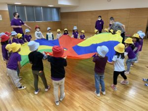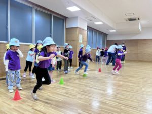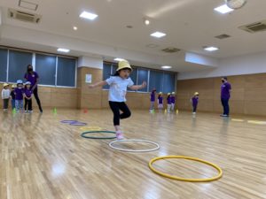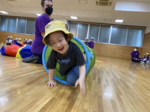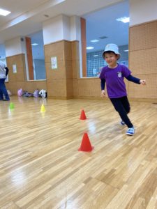 カラーコーンのエリアを、間違って抜かして次のトンネルに行こうとしてしまった子もいましたが、先生たちのヘルプのもと楽しみました。