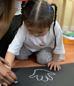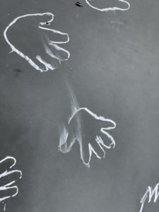 最後に、黒い大きな画用紙に、ホコリに見立てた白のチョークで手形を取りました。