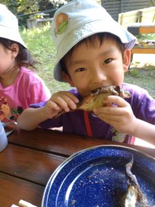 川からあがっていよいよ皆が捕まえた魚を食べましたよ!