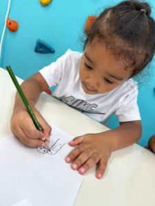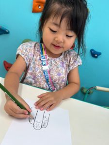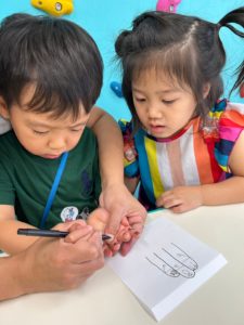 子ども達は指のイラストに何やら絵を描いています