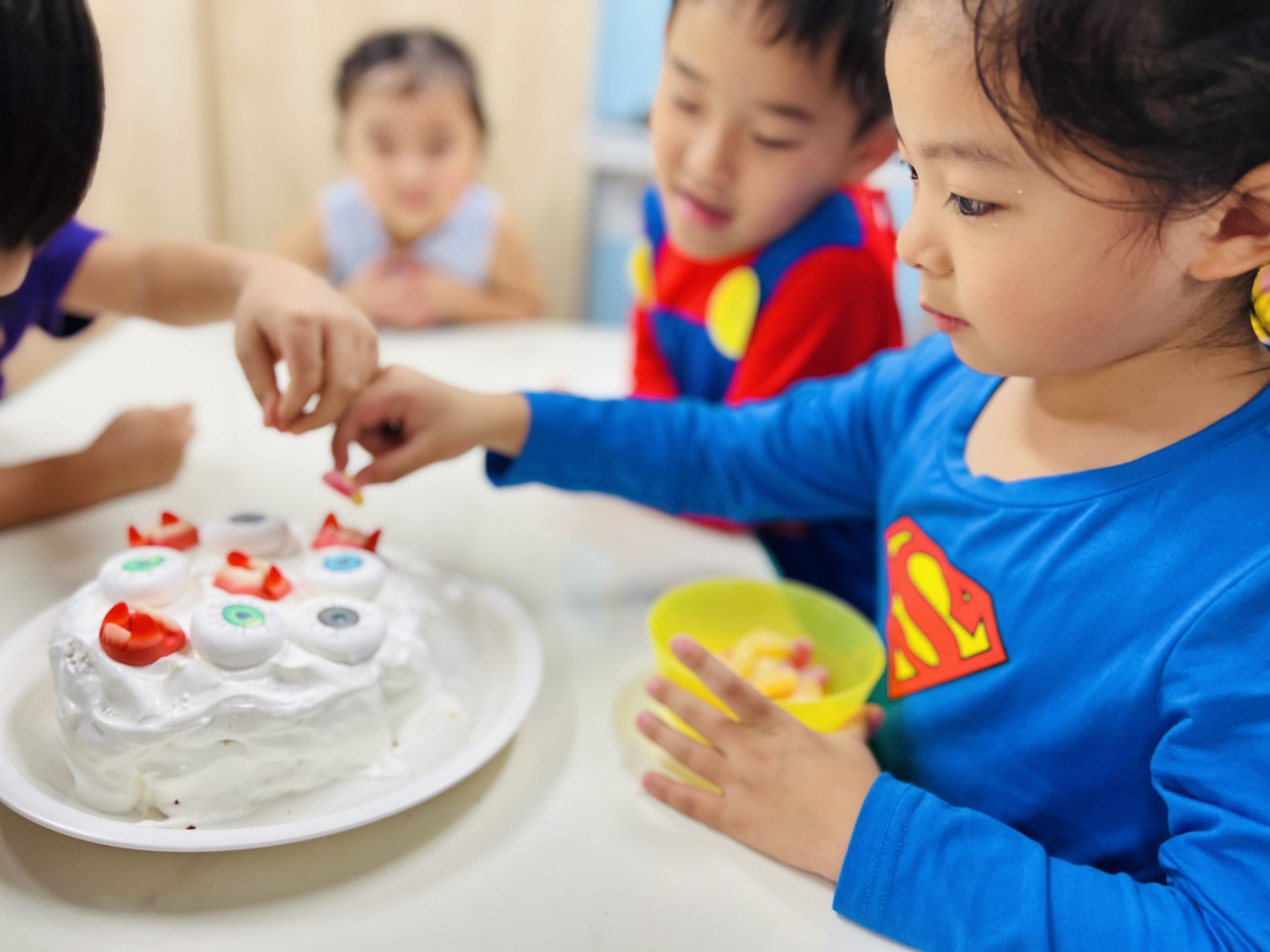 ゾンビの目玉グミやドラキュラの歯のグミをのせてデコレーションをしたら、
