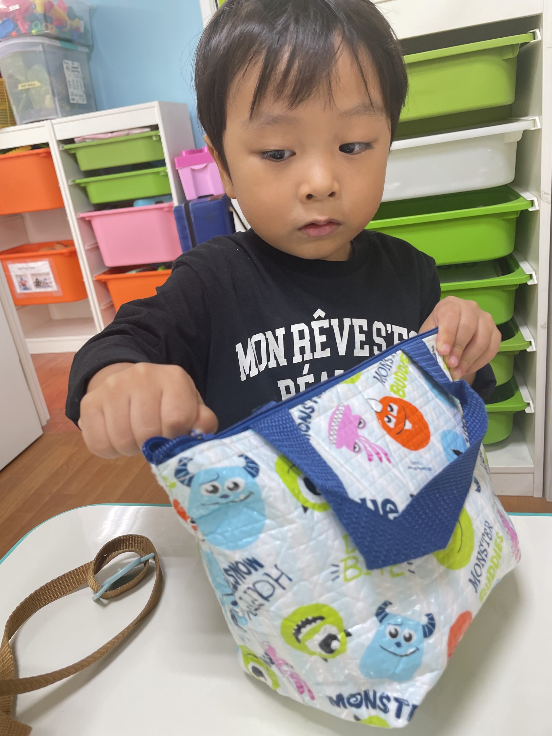 lunch bagのチャックを閉めるところまでひとりでやります!