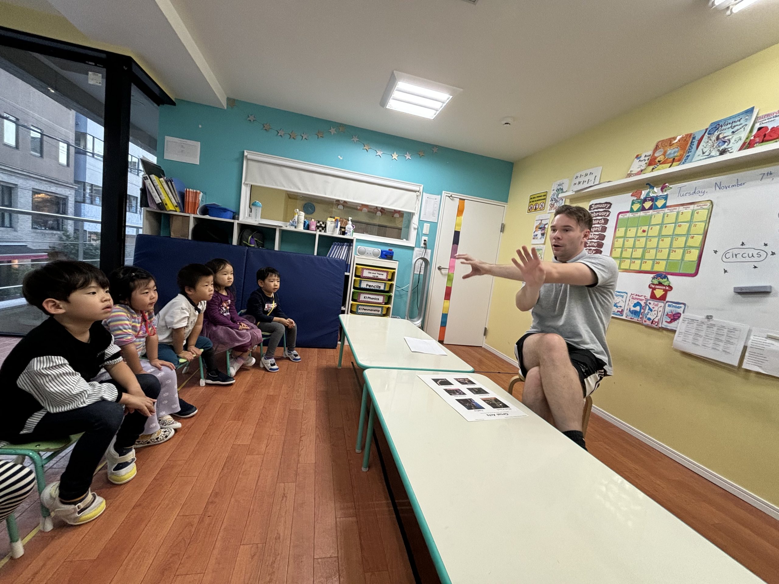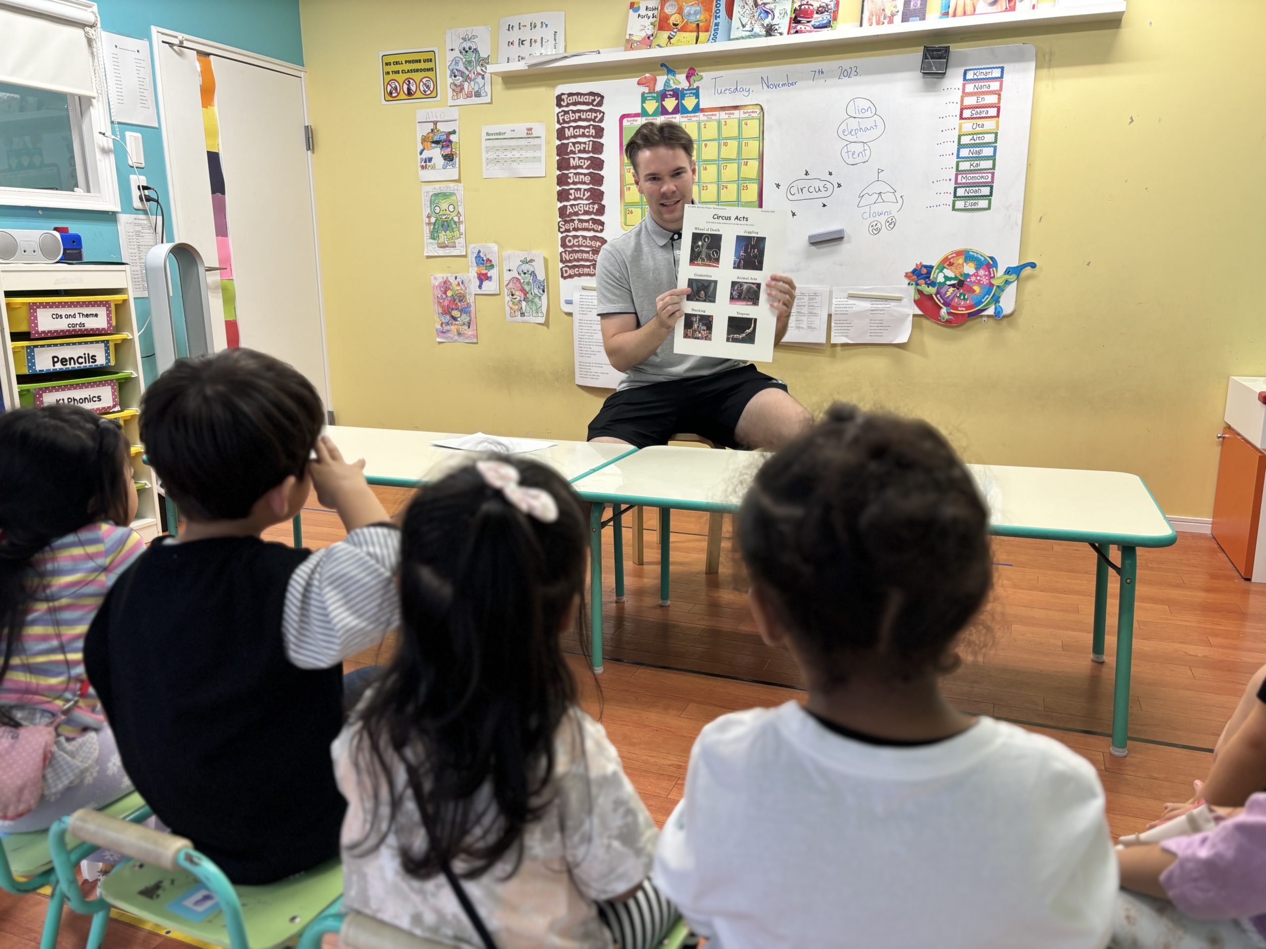 その他、サーカスで見られる主なショーをジェスチャーなども交えて紹介し、子どもたちは興味津々になって話を聞いていました。