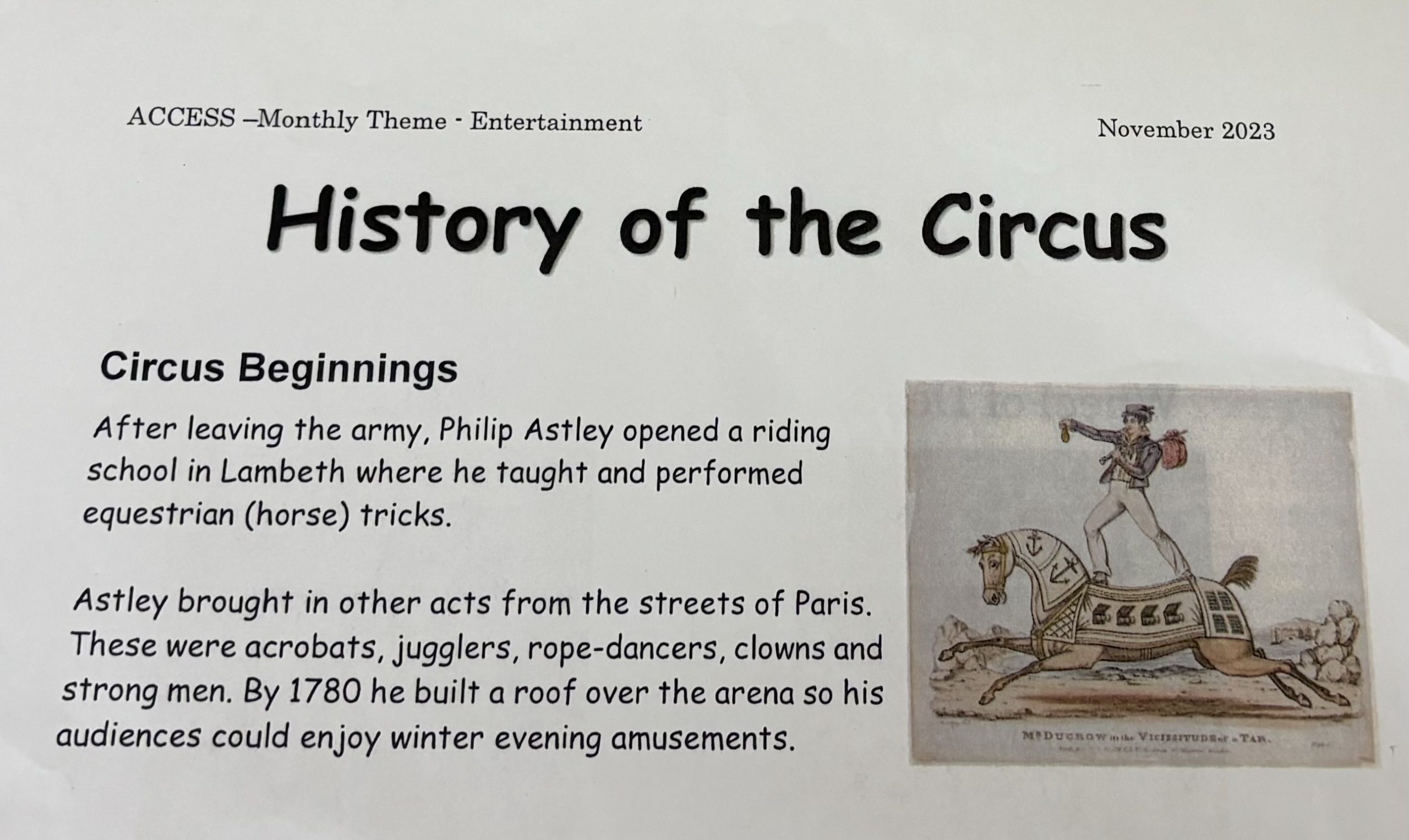 サーカスに登場する動物は、lion, elephant などが思い浮かびますが、サーカスの始まりは馬の背中に立つ曲芸だったそうです!