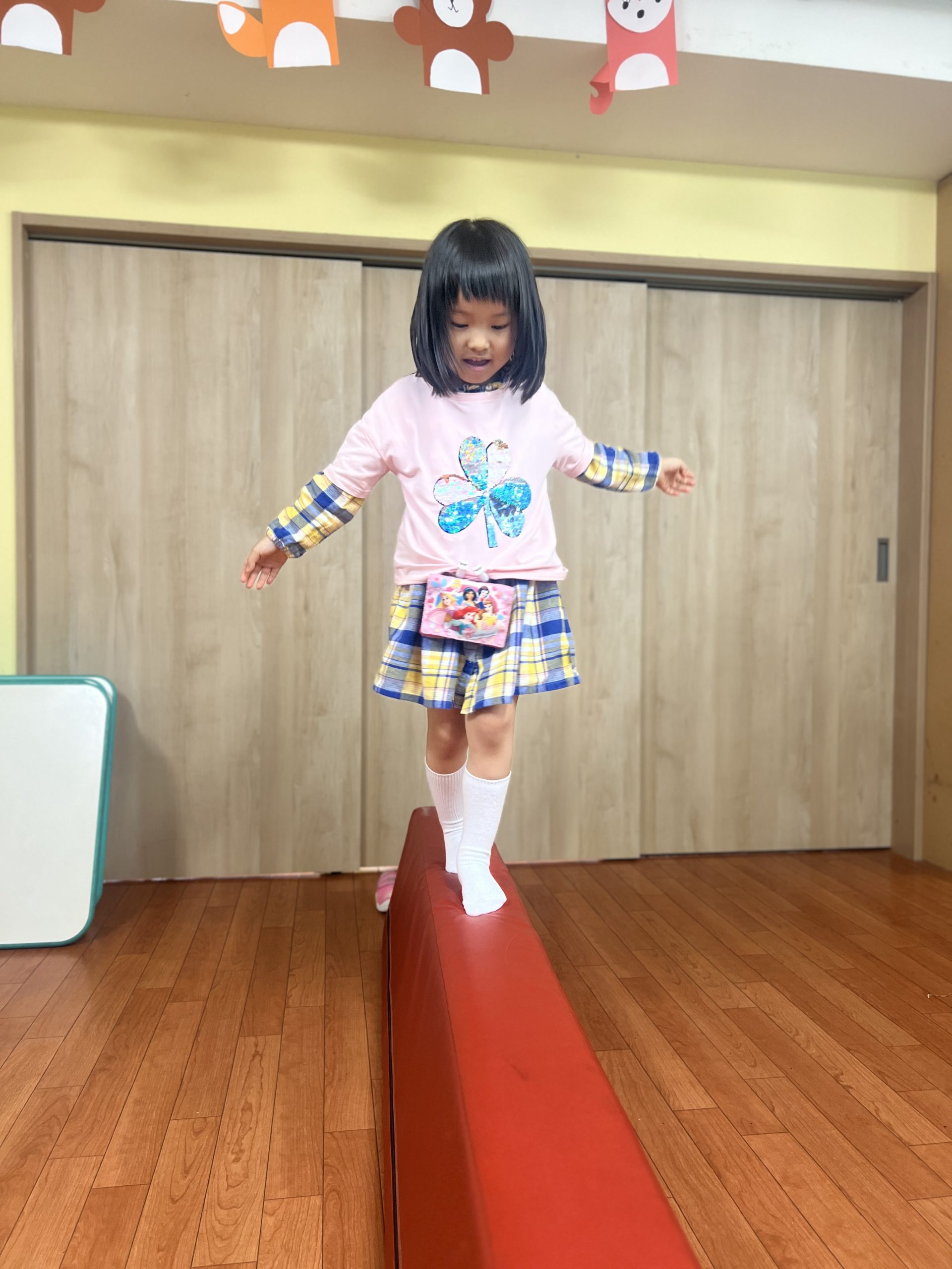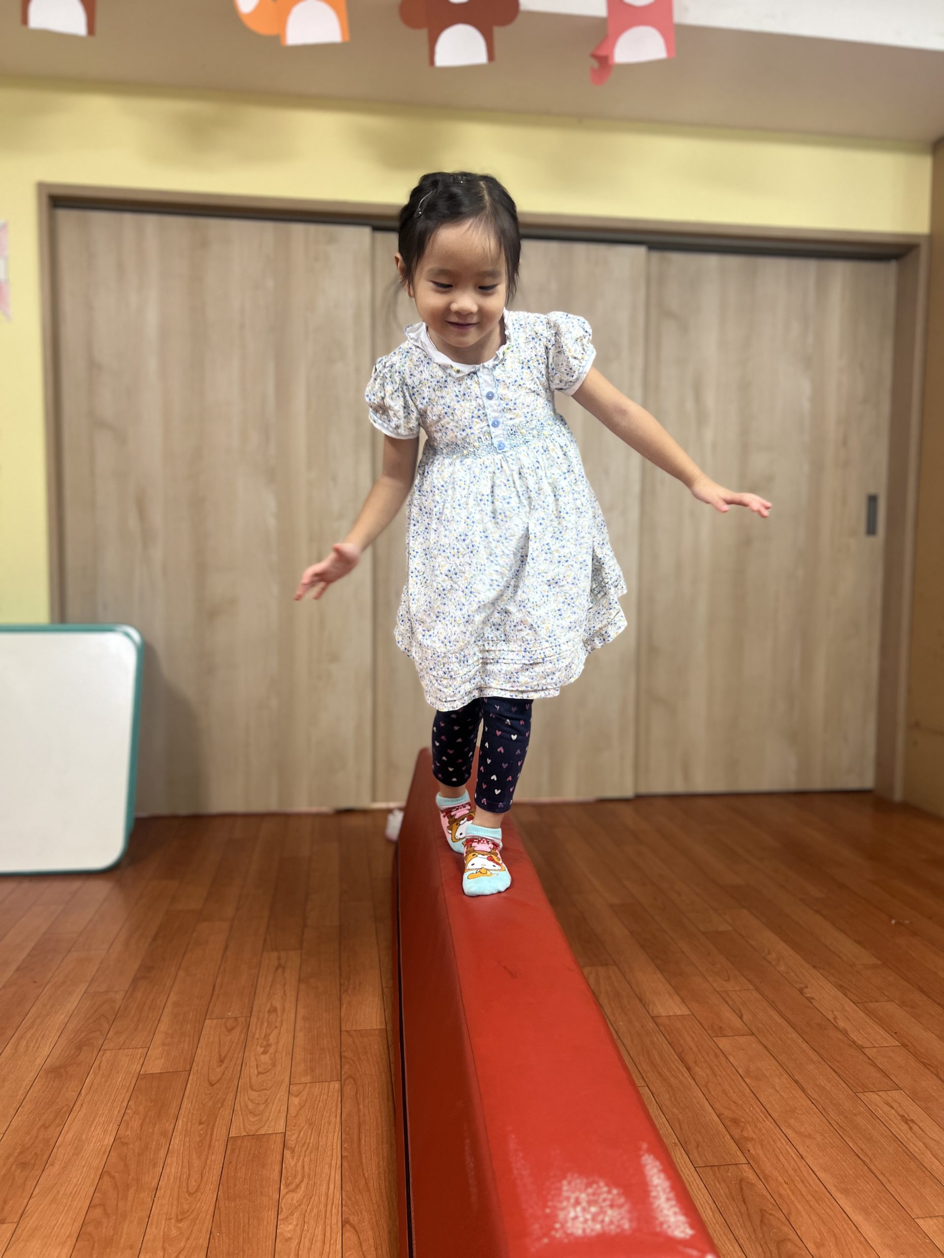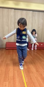 テープの上を渡ったり、素材の柔らかい平均台を使い、床に落ちないように気をつけながら渡りました。