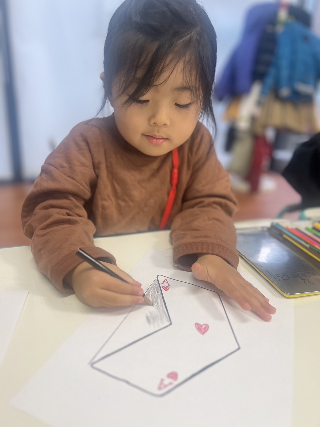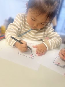 年少さんの子ども達は用紙に描かれた変わった形のトランプに影をつけています。