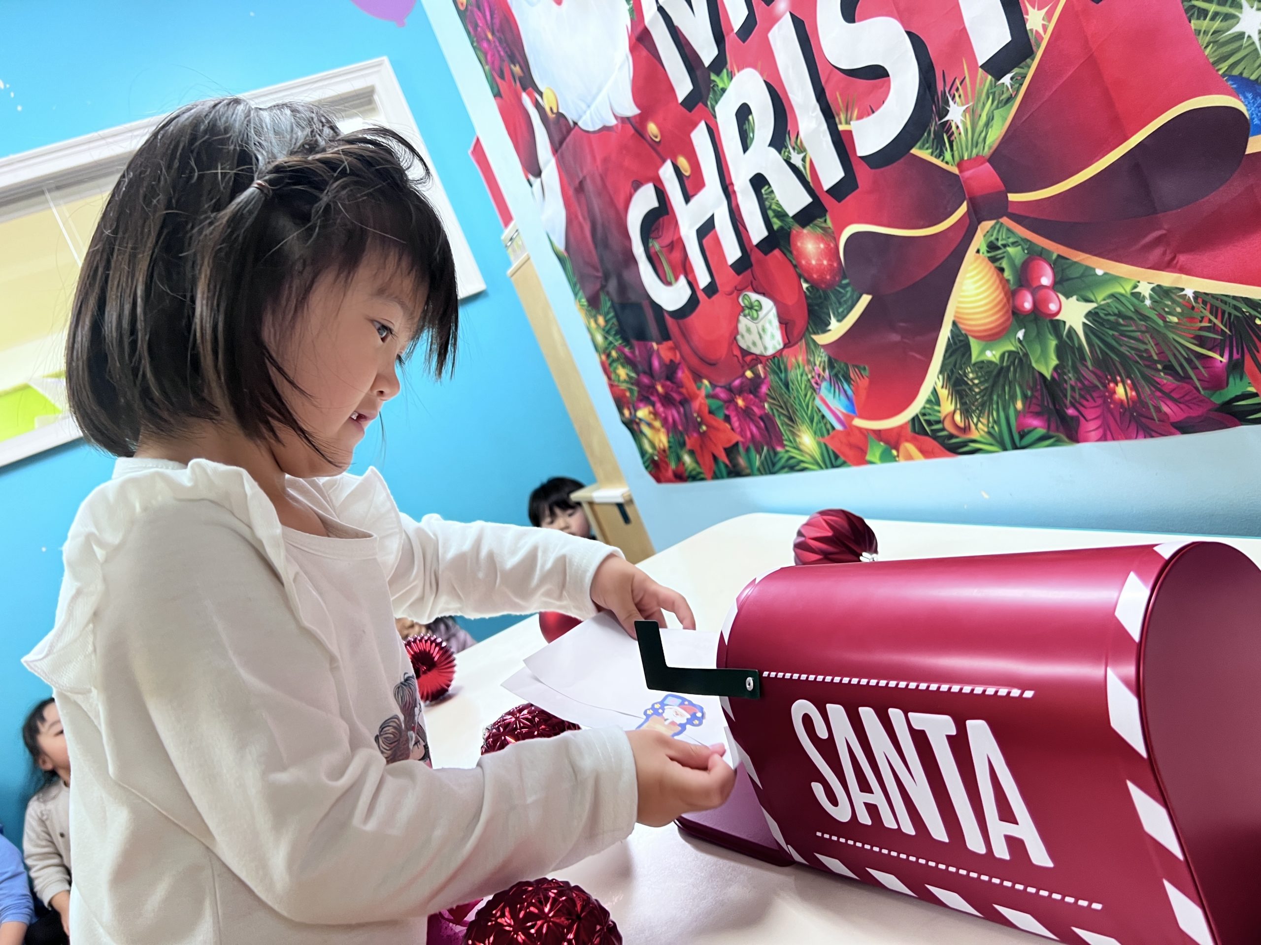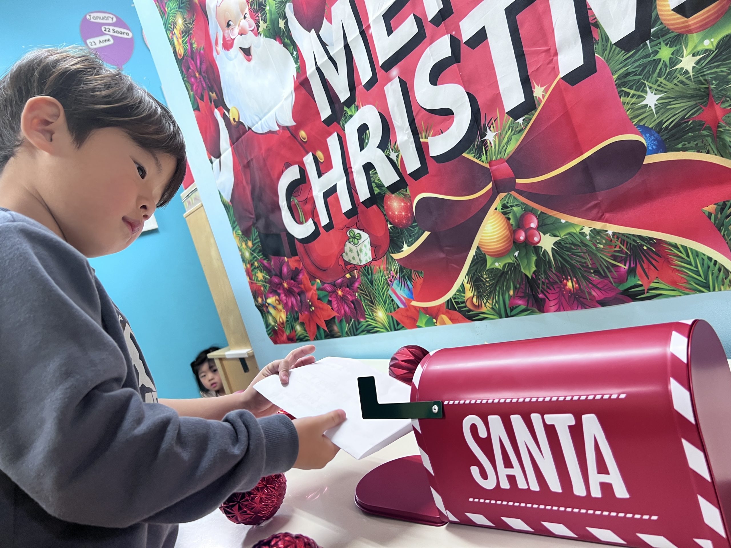 書いたお手紙はサンタさん行きのポストに入れました!