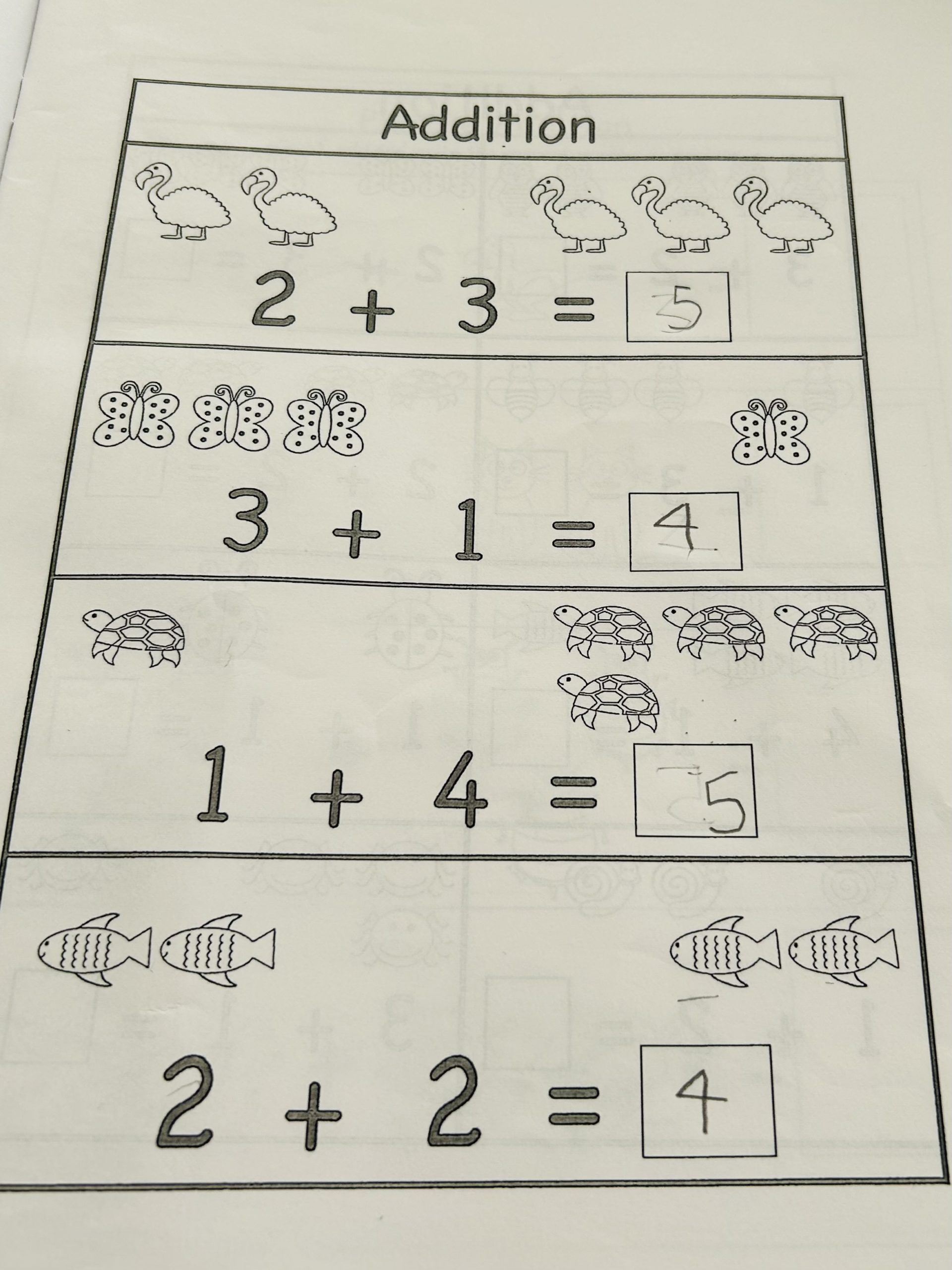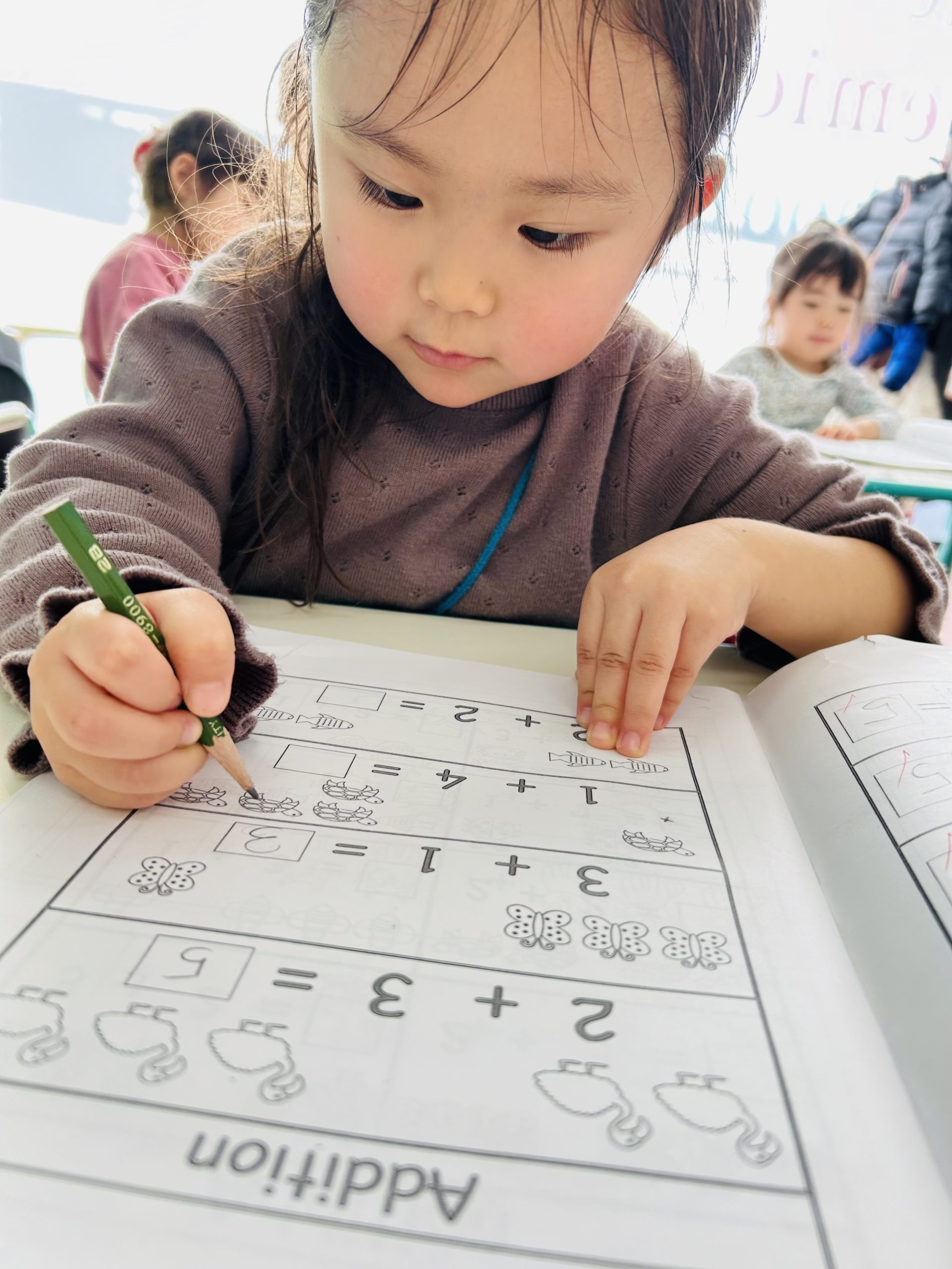 こちらが今日行った足し算のページです。とても綺麗に数字が書けていますね😊