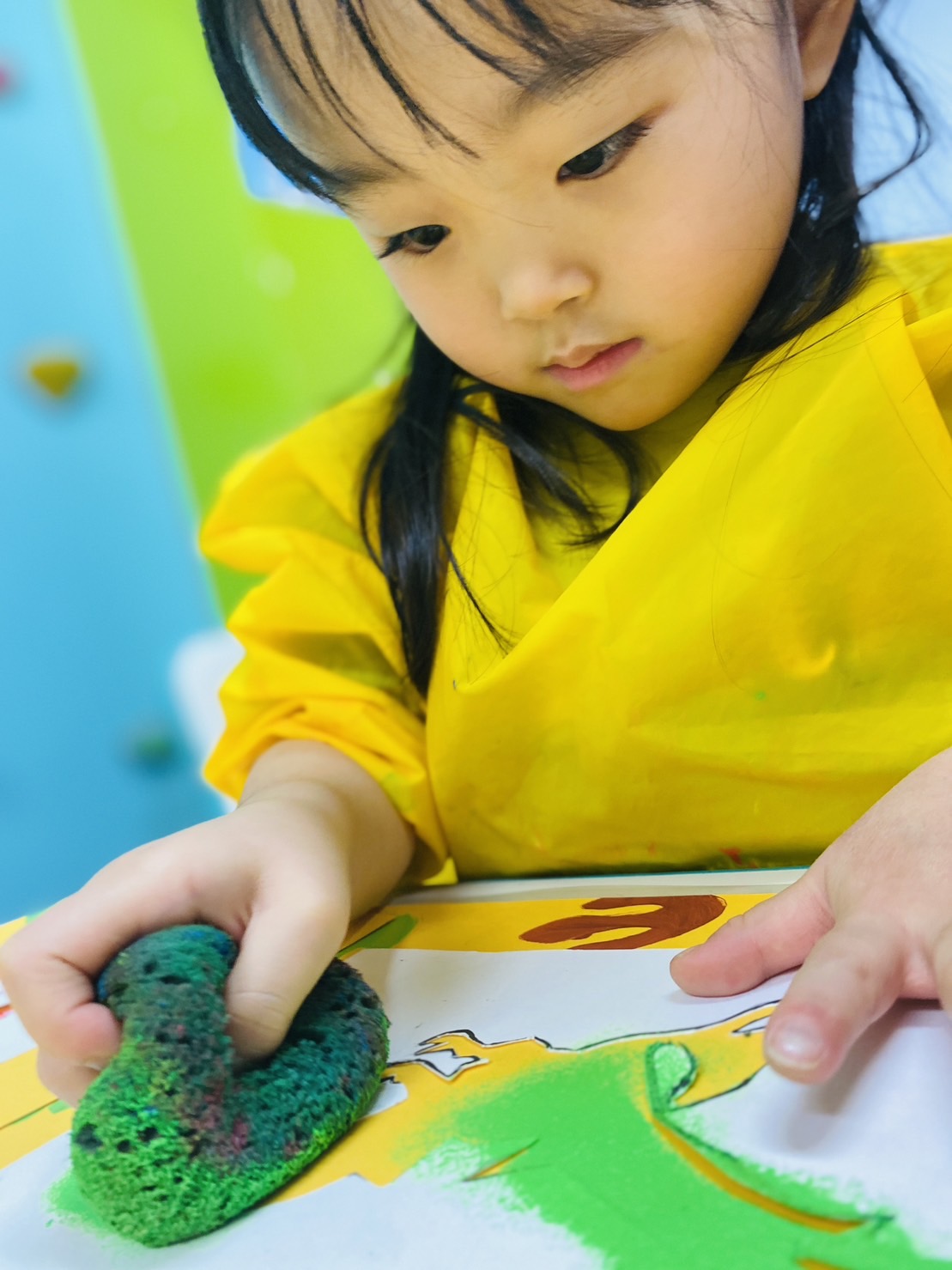 画用紙にステンシルテンプレートを置き、絵具を染み込ませたスポンジをスタンピングしていきます。