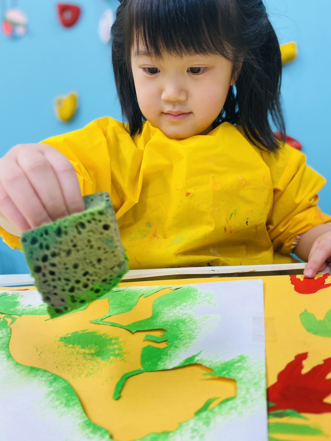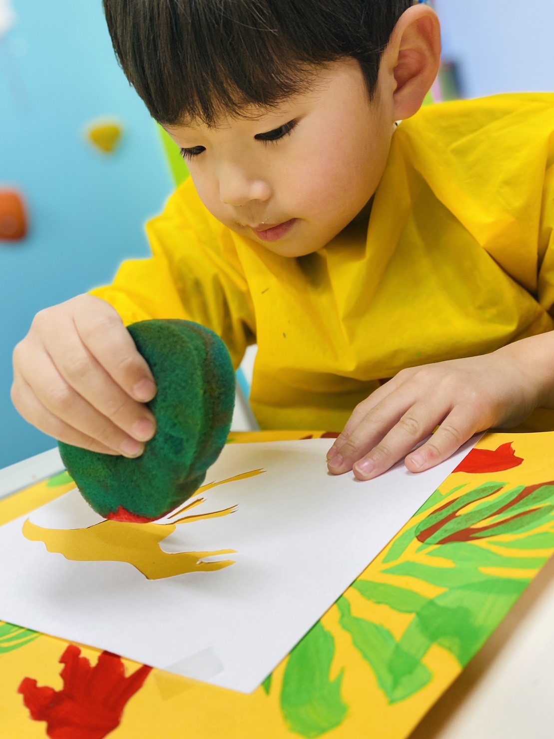 画用紙にステンシルテンプレートを置き、絵具を染み込ませたスポンジをスタンピングしていきます。