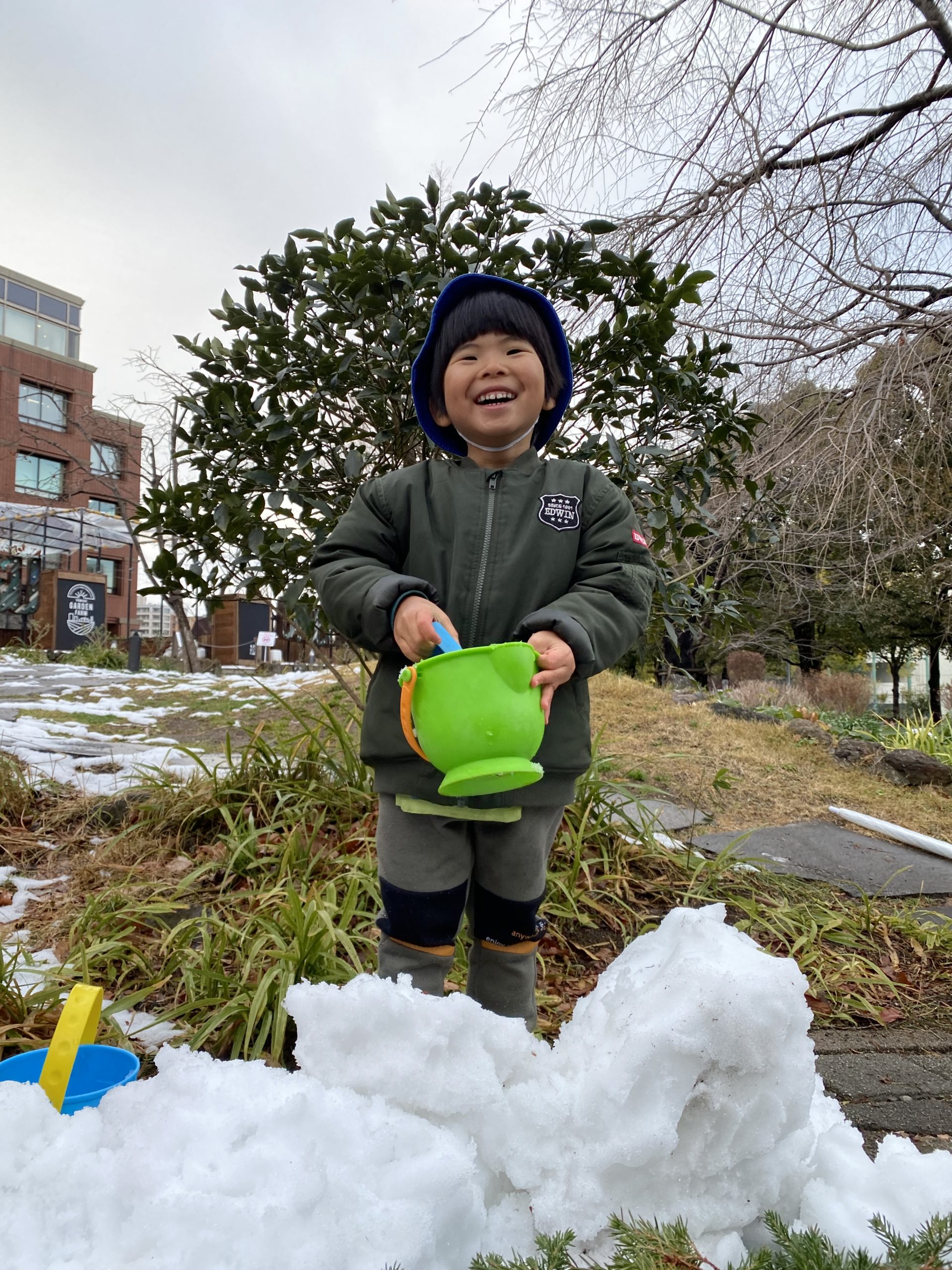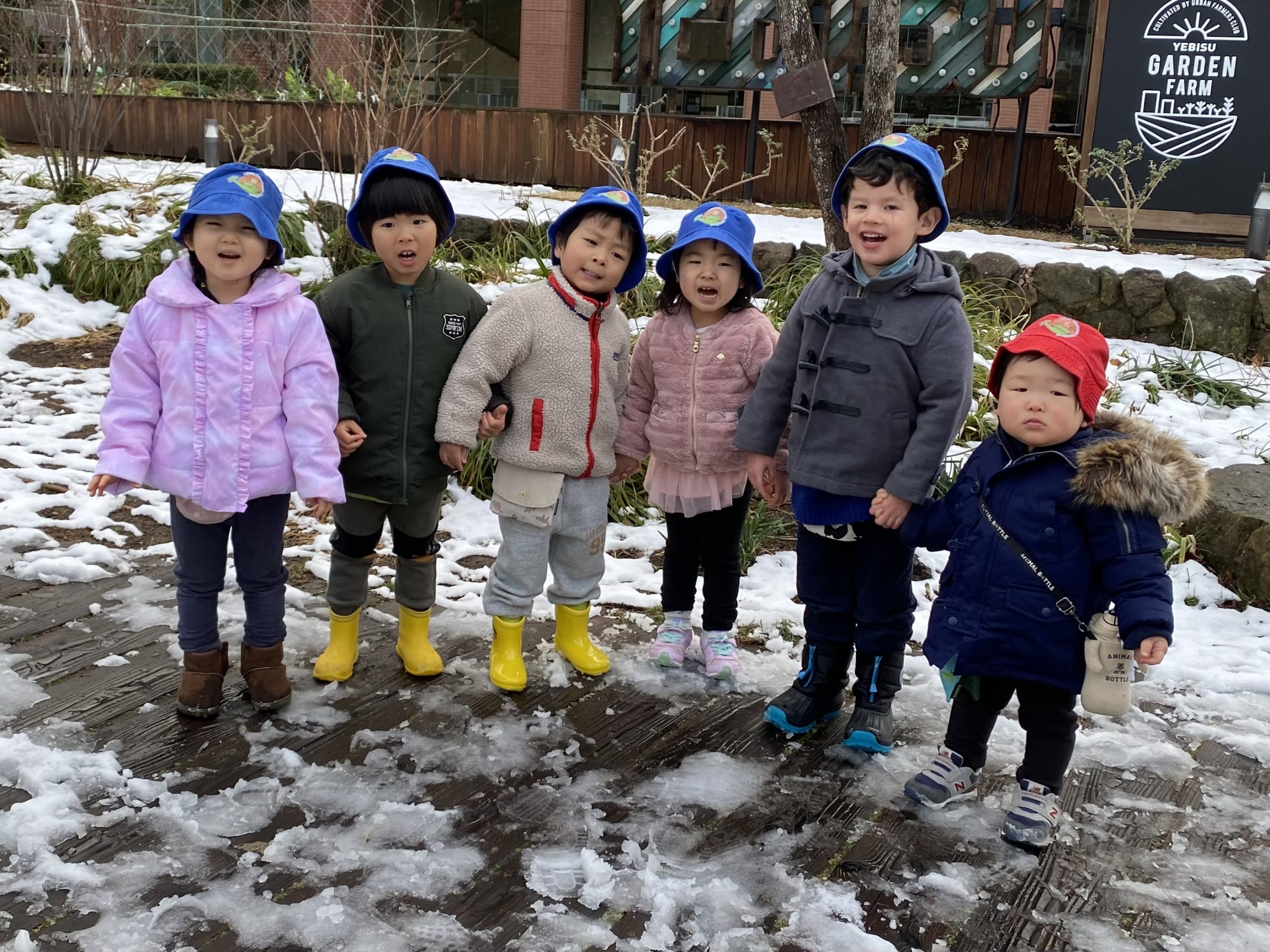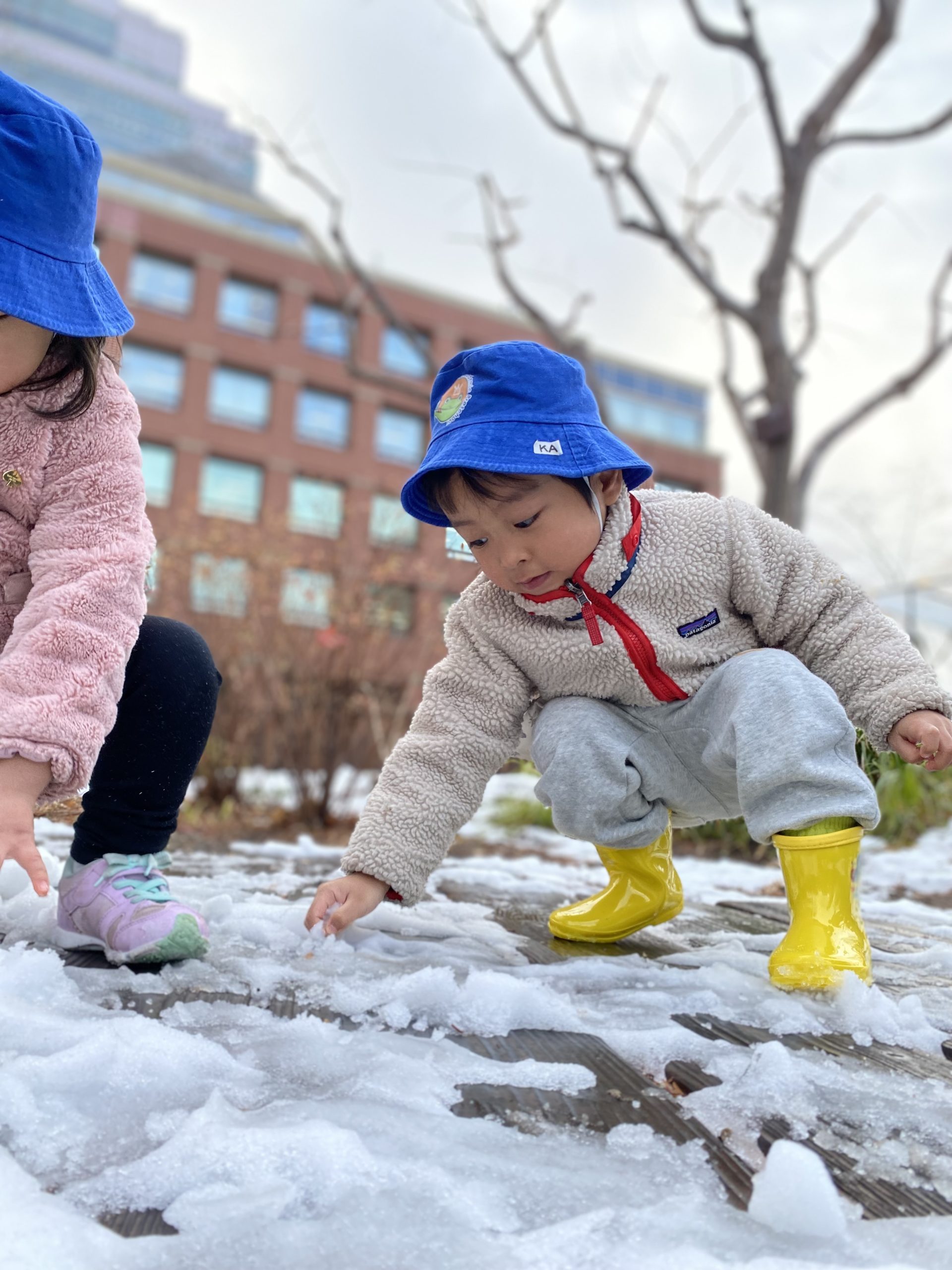 P1(2歳児クラス)、P2(3歳児クラス)のみんなは雪に興味津々!