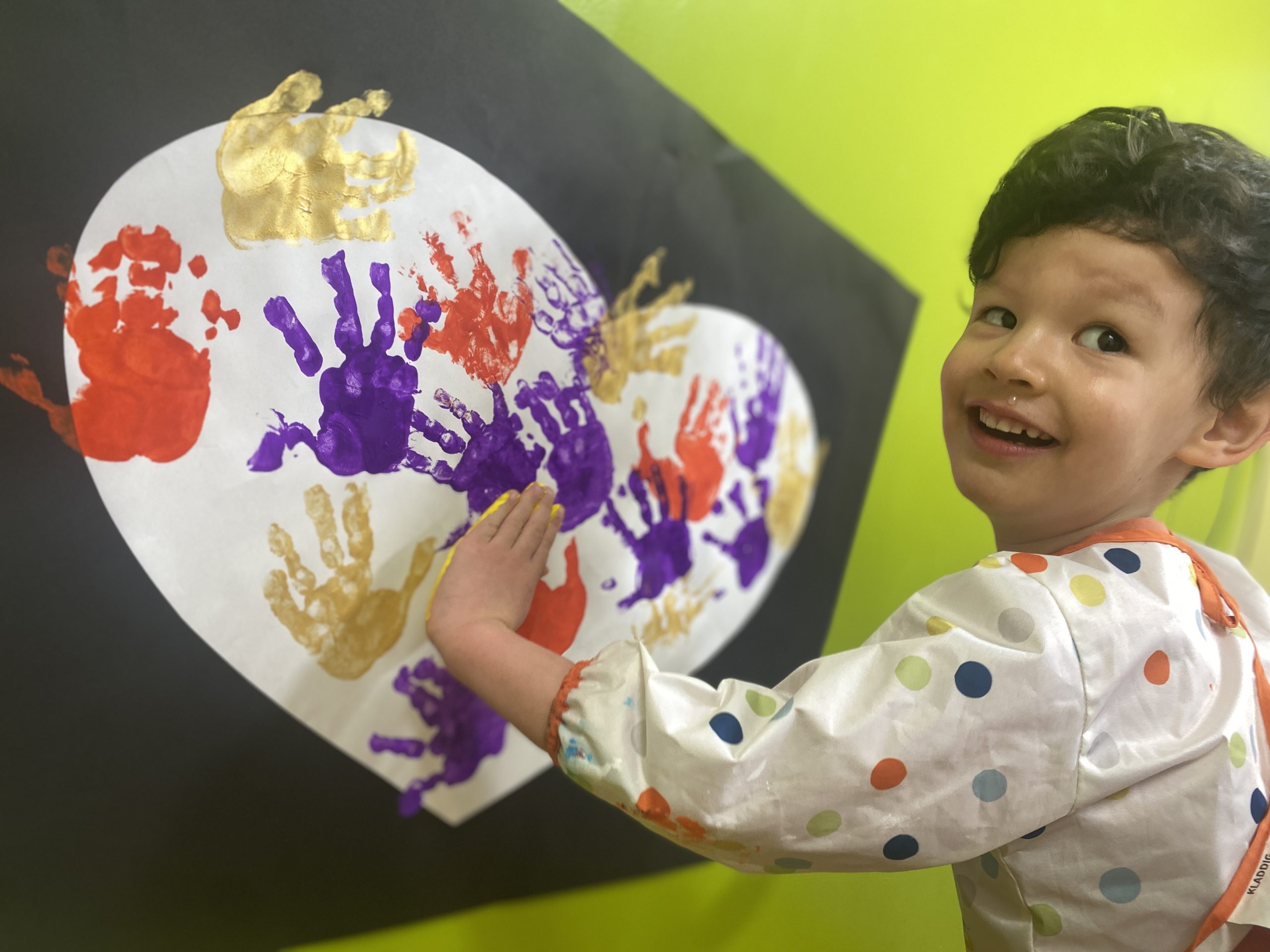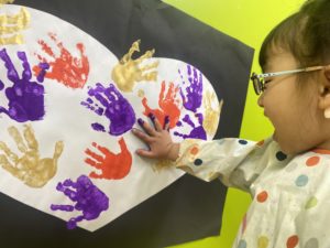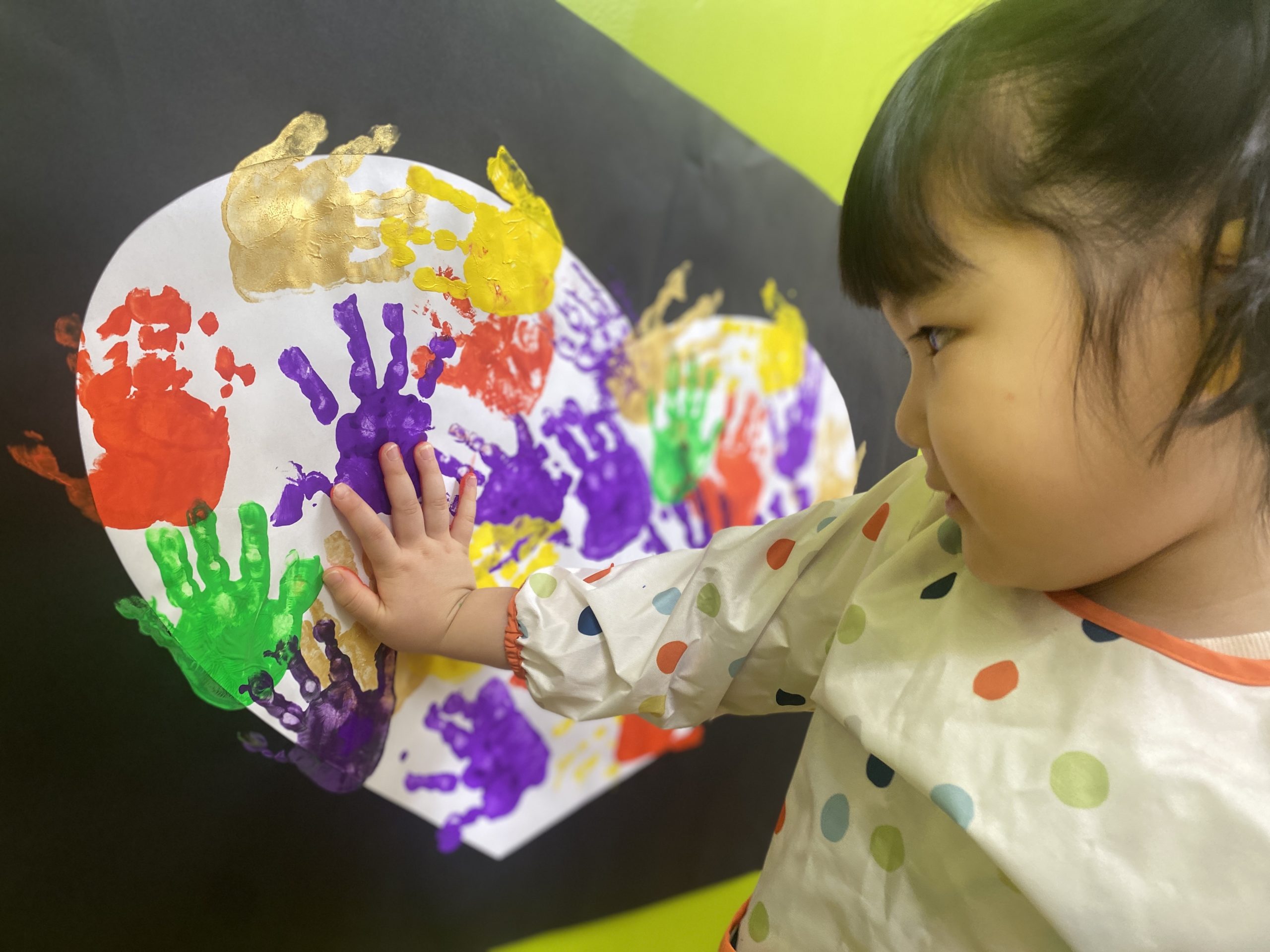 大きくて真っ白なHeartにみんなのHand printでカラフルに色付けていきます。