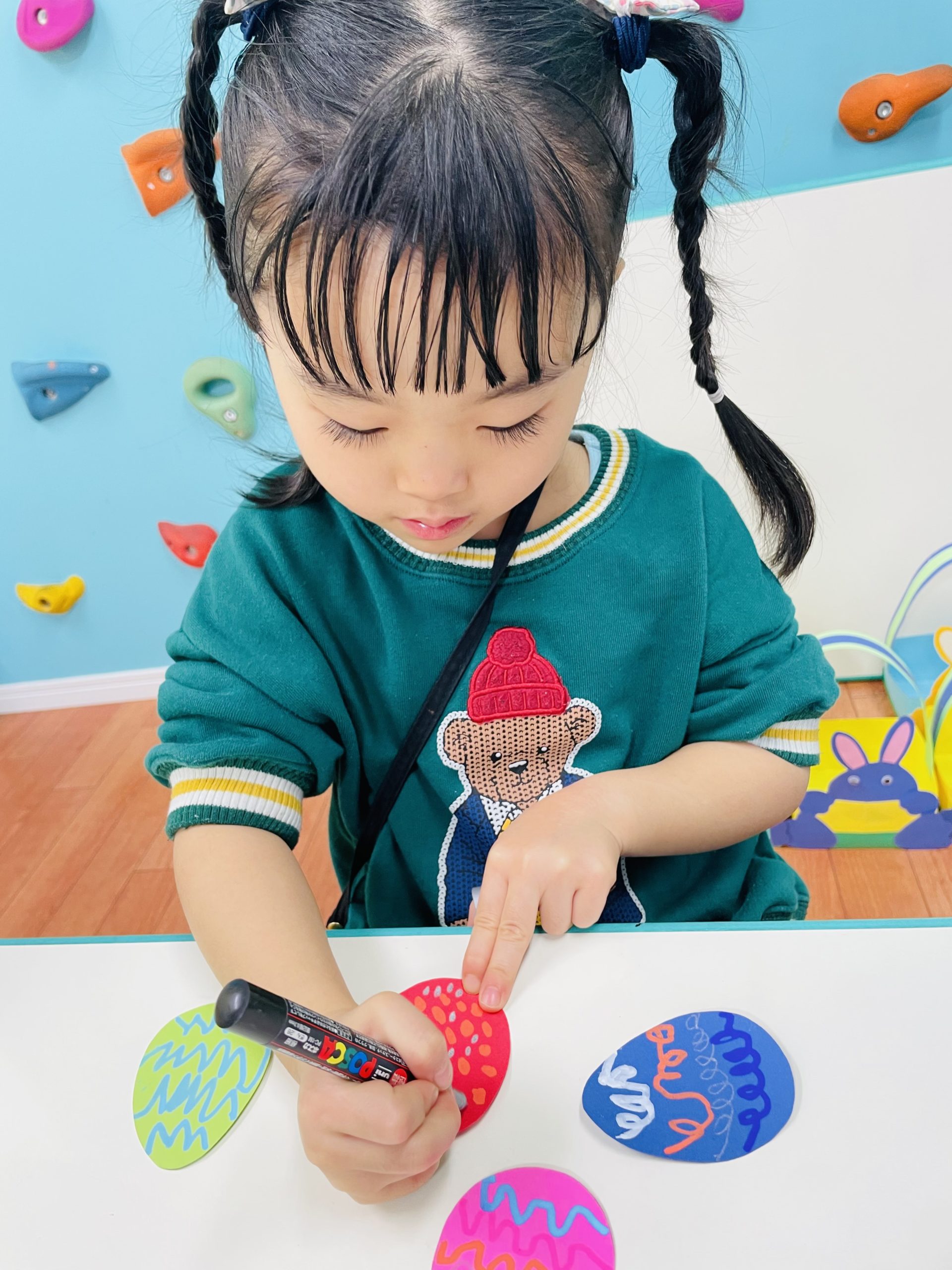 RabbitがついたカラフルなBasketに、ポスカでデコレーションしたEggやCarrotを飾り付けていきます。