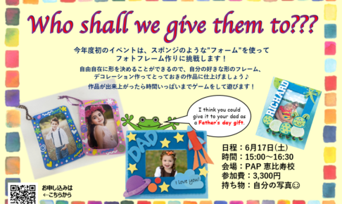 6月には父の日がありますね! もうプレゼントは考えましたか? 6月17日土曜日にPhoto Frame 作成のイベントを行います! 外部の方もご参加可能です。当日はEnglish だけのイベントを楽しみましょう! お申込…