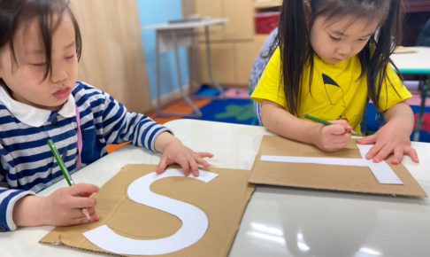 今月の月曜のArt Timeでは新学期ということで自分について紹介するActivityを行っています。 年少さんたちですがみな真剣に色塗りをしています。 自分の名前のイニシアルの紙にクレヨンで模様や色塗りをしました。 ク…