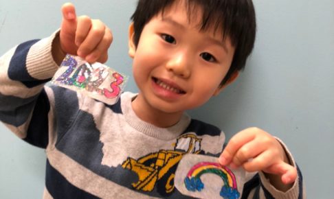 月曜Art Time です。 今日は子どもたちはオリジナルのシールを作っています。 キラキラの下地のイラストを選び、サインペンなどでカラフルに色付けをしました。 2023の数字やレインボーなど皆張り切ってカラーリングして…