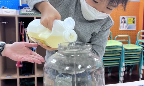 今月のScienceは、様々な「実験」がテーマです。 本日は、Elephant Toothpaste という実験を行いました。 まず、茶色の酵母をお湯で混ぜます。 混ぜる前と後、それぞれ匂いを嗅いでみました。 お湯を混ぜ…