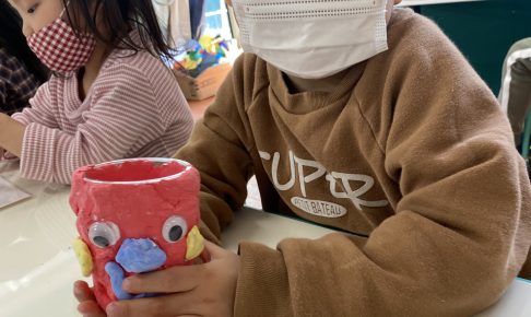 今日のAquariusクラスのARTの時間です。 紙コップの上から粘土を貼り付けて顔をつけデコレーションをしました。 自分で何色の紙粘土が欲しいかセンテンスで答えてくれました。 Pencil standの完…