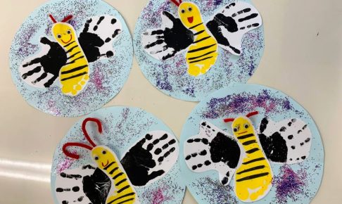 昆虫のArtの最終日の本日はFoot PrintでBugを作成しました! こちらは年少さんですが、手も足も昨年よりずいぶん大きくなりました Yellow Foot Print とBlack Hand Printで何を描く…