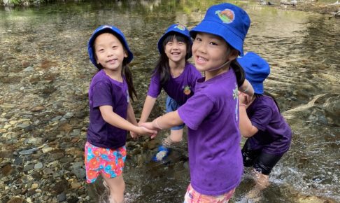 今日Galaxyのクラスの皆は川遊びの遠足に行って来ました! スクールバスではいつもどおりクイズや歌で盛り上がり、あっという間に到着! 川へ降りる道は少し険しかったのですが、皆一歩一歩慎重に、 先生と一緒に降りる生徒さん…