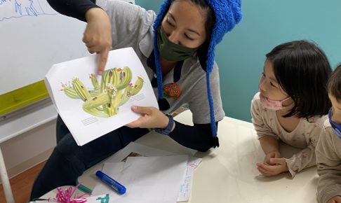 月曜のArtでは月に1度ほどスケッチの練習をしています。 今日は春のスケッチということでアゲハチョウの幼虫を描きました。 のぞきこんでいたのは青虫Caterpillarです。 まずはスケッチをして 色も塗りました。年中さ…