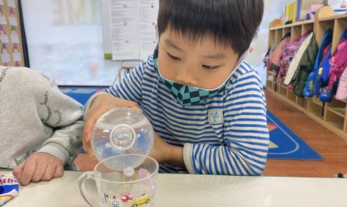 P2クラスの様子です。小さい頃から細かい作業ができるように手先を使うクラフトを行なっています。 今日は糸にビーズを通すクラフトです。 ダンスタイムは元気よく踊ります!! 今日も一日楽しかったね!