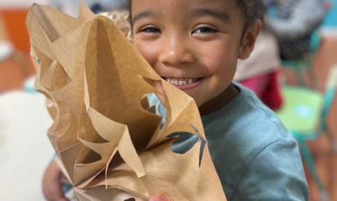 本日のArt Timeでは面白い素材でクリスマスのシンボルの星のクラフトに挑戦しました! カットされた茶色い袋を何枚ものりで重ねていきます。 しっかりと合わせて貼るように皆真剣です。 貼り合わせるとどうなるのかな? 大き…
