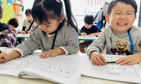 本日は年少さんクラスのMathの授業の様子をご紹介します。 年少さんは新年度から数字を書く練習をしたり、数字をカウントすることを学びます。 半年ほど経つと足し算や引き算の練習を毎週学習します。 今日の年少さんはテキストを…