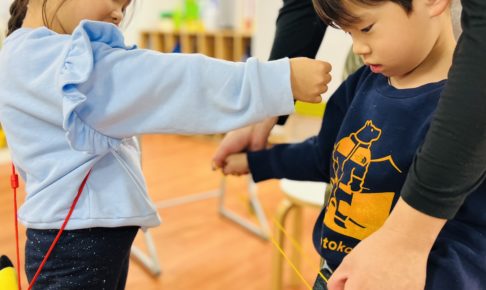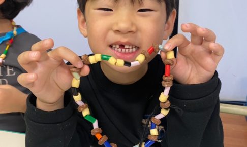 本日のArt Timeでは食べられるアクセサリーを作りました チョコワやコーンなどを使ってネックレスを作りました。 年少さんたちはMotor Skillが上がってきたので… ストリングにチョコワやビーズを通すのはラクラク…